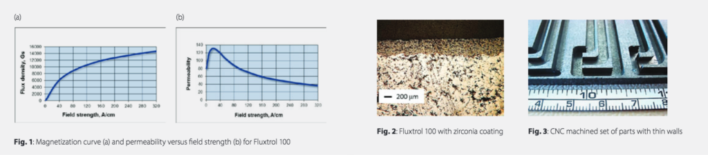 SMCs are very versatile materials. Wide and always growing variety of applications sets new demands to the material properties [2, 4]. These applications include biomedical treatment, food packaging, electronic clean room processing, crystal growth, traditional heat treating, metals and non-metals melting, and many others. Typically the following groups of properties must be considered: mechanical, magnetic, electrical, thermal and chemical. For special applications the magnetostriction and acoustic properties may be also important. A significant number of SMC types are being used in industry. Three materials: Fluxtrol 100, Ferrotron 559H and Alphaform MF are selected for further description as representatives of different groups of SMCs [2, 3]. The first two materials are manufactured by pressing technology and the third one is formable. Some magnetic, thermal and mechanical properties of these materials are presented in Table 1.
