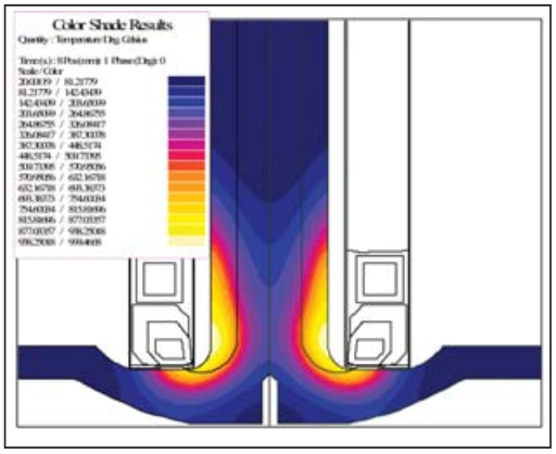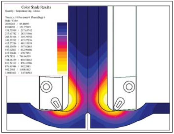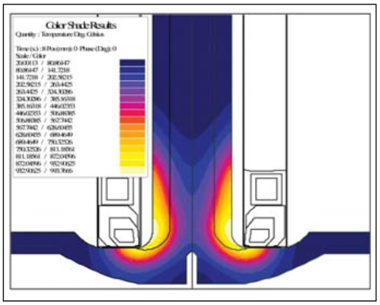 The pattern developed using the 1-mm gap for both inductors looks reasonable, but this is at the bottom end of our tolerance. To evaluate the sensitivity to positioning, simulation was made for both cases with the coupling gap increased to 2 mm (upper end of the tolerance). For both cases, the same dwell time and power level are used because in production that’s how the machine will operate. The heat pattern in the dwell for the standard two-turn inductor is shown in Fig. 10, and Fig. 11 shows the pattern for the new optimized inductor. With the traditional two-turn, the heat pattern now does not extend completely through the fillet, and this part would most likely be out of specifications. With the new optimized inductor, the pattern still goes through the fi llet, and the part is well within specifications.